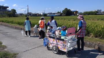 田んぼ道を保育園児がさんぽ